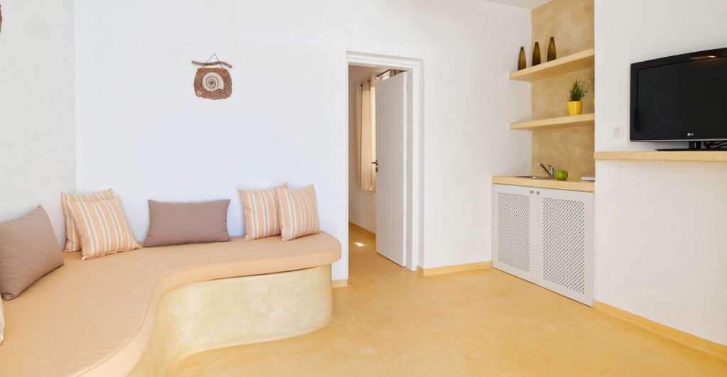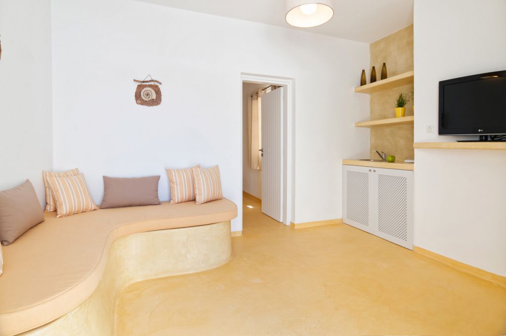 Απολαύστε τον πρωινό ήλιο και το μοναδικό φως του Αιγαίου στην μεγάλη ιδιωτική βεράντα. Χαλαρώστε στο ευρύχωρο σαλόνι και αφήστε τις αισθήσεις σας να ανακαλύψουν την γαλήνη και την ηρεμία. Η φιλόξενη διακόσμηση και η ξεχωριστή ατμόσφαιρα υπόσχονται μια άνετη διαμονή, ιδανική για οικογένειες, δύο ζευγάρια ή μια παρέα φίλων.